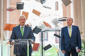 Trócsányi László, a Magyar Jogász Egylet elnöke, a Károli Gáspár Református Egyetem rektora, a Fidesz európai parlamenti (EP-) képviselõje beszédet mond a III. Magyar Jogi Könyvszalon megnyitóján a budapesti Károlyi-Csekonics palotában 2023. október 7-én. Mellette Sulyok Tamás, az Alkotmánybíróság elnöke.