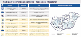 A fejlesztést-gyártást ma már hat klaszter fogja össze. A repülőgépiparhoz kapcsolódó tevékenységek Békés megyében koncentrálódnak, Békéscsabán a repülőteret és a helyi szakképzési centrumot is átalakítják az iparág igényeinek megfelelően. Egy másik nagy klaszter a kézifegyvergyártás, amely a Csongrád–Kecskemét–Kiskunfélegyháza tengelyen húzódik, magában foglalva a kutatás-fejlesztést és a gyártást. Zala megyében sorakozik fel a harc- és gépjárműgyártás, jórészt Zalaegerszegen, a több mint huszonötezer négyzetméteres Lynx-gyártócsarnok szomszédságában működő tesztpálya off-road elemekkel bővül, így az elektromos és önvezető gépkocsikon túl már drónok és harcjárművek kipróbálására is alkalmassá válik. Első ütemét nyáron már át is adták.