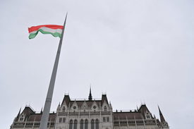 Katonai tiszteletadás mellett felvonták a nemzeti lobogót a március 15-ei nemzeti ünnepen, szerda délelőtt az Országház előtt.