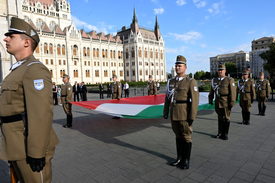 Katonai tiszteletadással felvonják Magyarország nemzeti lobogóját a Szent István-napi állami ünnepségen a budapesti Kossuth téren 2025. augusztus 20-án