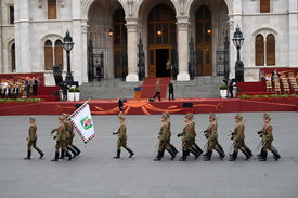 Katonai tiszteletadás mellett, Áder János államfő jelenlétében felvonták Magyarország nemzeti lobogóját az augusztus 20-ai állami ünnepen, péntek reggel Budapesten, az Országház előtti Kossuth Lajos téren.