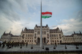 A félárbócra engedett nemzeti lobogó az Országház előtti Kossuth Lajos téren 2021. október 6-án