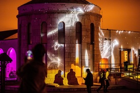 Fényfestés a Farkasréti temető ravatalozóján mindenszentek napján, 2022. november 1-jén