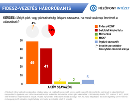 Egy „most vasárnap” tartott országgyűlési választáson az aktív szavazók 49 százaléka a Fideszre voksolna, s csak 41 százalékuk szavazna a baloldali közös listára – derül ki a Nézőpont Intézet kutatásából. Két héttel a választások előtt sem zárul az olló a két nagy politikai tömb között, ráadásul az adatokból úgy tűnik, hogy az orosz-ukrán háború kifejezetten a kispártok támogatottságára hatott negatívan.A Nézőpont Intézet március 16. és 21. közötti közvélemény-kutatása alapján egy „most vasárnap” tartandó országgyűlési választáson az aktív szavazók közel fele (49 százalék) a Fidesz-KDNP országos listájára szavazna, a baloldali összefogás pedig a szavazatok 41 százalékára számíthatna. A pártok szimpatizánsainak mélyelemzéséből szembetűnik, hogy a Fidesz szavazótáborának 4 százaléka tekinthető bizonytalannak, míg ugyanez az arány a baloldal esetén 41 százalékos. Utóbbi adat Márki-Zay Péter népszerűtlenségével magyarázható. Ennek oka, hogy a kutatás szerint a baloldali szavazótábornak kicsit több mint fele (56 százalék) felelt Márki-Zay Péter nevével arra a kérdésre, hogy „Ön inkább azt szeretné, hogy Márki-Zay Péter legyen Magyarország miniszterelnöke, vagy azt, hogy Orbán Viktor?”, ami jól jelzi, hogy a baloldali kormányfőjelöltjének nincs felhajtóereje a szavazatmaximáláshoz (a válaszadók maradék része nem tudott egyértelműen állást foglalni a kérdésben).