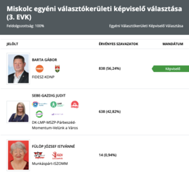 Miskolc 3. egyéni választókerületében önkormányzati képviselőt választottak, mert a korábbi képviselő lemondott mandátumáról. Az időközi választáson három jelölt indult: Barta Gábor (Fidesz-KDNP), Fülöp József Istvánné (Munkáspárt-ISZOMM) és Sebe-Gazdag Judit (DK-LMP-MSZP-Párbeszéd-Momentum-Velünk a Város).Az időközi választást a Fidesz-KDNP színeiben induló Barta Gábor nyerte, aki a voksok 56,24 százalékát szerezte meg.