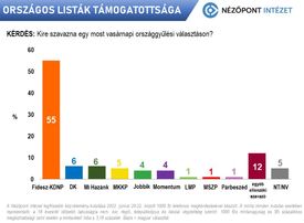 Az ellenzéki szavazók közel egyharmada nem tud pártot választani – derül ki a Nézőpont Intézet legfrissebb kutatásából. Egy most vasárnap tartott választáson a Fidesz-KDNP 55 százalékos támogatottsággal rendelkezne, az ellenzéki pártok közül pedig csak a Demokratikus Koalíció és a Mi Hazánk (6-6 százalék), illetve a Kétfarkú Kutya Párt (5 százalék) jutna be a parlamentbe. A Nézőpont Intézet munkatársa szerint az ellenzék továbbra sem tud az emberek számára fogyasztható alternatívát kínálni, az Alapjogokért Központ pedig arra emlékeztet, hogy 32 helyből 28 a fideszes jelölté lett.Egy „most vasárnap” tartott országgyűlési választáson a Fidesz-KDNP a választók 55 százalékára számíthatna – olvasható a Nézőpont Intézet legfrissebb felmérésében.