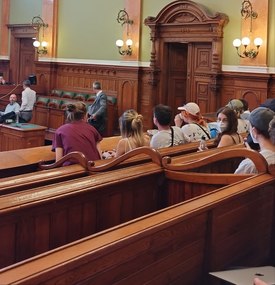 Dr. Sós József bíró kérdéseire válaszolva a magát zsidónak valló, amúgy Hadházy Ákos tüntetéseinek szereplőjeként ismert Gimpel Tamás tanú úgy emlékezett, hogy a 2023. február 11-én a Bank utcában súlyosan bántalmazott idős rockzenész kabátján egy koponya képében SS-jelvényt vélt fölfedezni, amire állítása szerint határozottan emlékszik, azt azonban különös módon nem tudta felidézni, hogy a megtámadott idős férfi ruházatán hol volt az állítólagos felvarró. Elmondta, hogy nagyjából öten támadták meg a sértettet, akit szerinte nem akartak komolyan bántalmazni. Ez meglepő állítás az eddigi tanúvallomások és a megtámadott férfi rendkívül súlyos sérülései ismeretében: szétnyílt a feje, arccsontja szilánkosra tört, az orvosi szakvélemény szerint sérülései két hónap alatt gyógyultak. Ráadásul a 2023-ban tett vallomásában még úgy nyilatkozott, hogy a támadók erősen ütlegelték a sértettet. Összességében a tanú, aki a tárgyalóteremből távoztában odaintett az antifasiszta hallgatóságnak, érzékelhetően jelentékteleníteni igyekezett a sérülések által is igazoltan brutális támadást. Érdeklődve várjuk az október 8-i szembesítést.