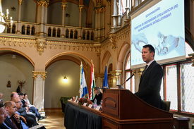 Fülöp Attila, a Belügyminisztérium gondoskodáspolitikáért felelős államtitkára beszédet mond a robotok és mesterséges intelligencia (MI) idősellátásban való alkalmazásáról szóló konferencián a Pázmány Péter Katolikus Egyetemen 2025. május 27-én