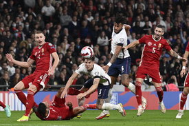 Szalai Attila, Kecskés Ákos és Nagy Zsolt, valamint az angol John Stones és Tyrone Mings a labda- rúgó világbajnoki selejtezők 8. fordulójában játszott Anglia–Magyarország-mérkőzésen a londoni Wembley Stadionban 2021. október 12-én. A találkozó 1–1-es döntetlennel zárult