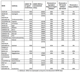 A vizsgált húsz OEVK-ban átlagban a Jobbik szavazóinak 53 százaléka valószínűsíthetően az Egységben Magyarországért jelöltjére szavazott. Minden OEVK-ban kisebb ennél jelentősen kisebb a Mi Hazánkra (6. oszlop), valamint a Fideszre szavazók aránya (7. oszlop).