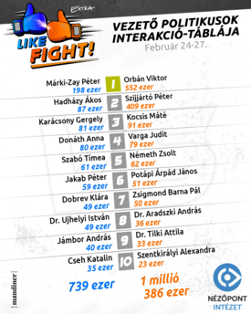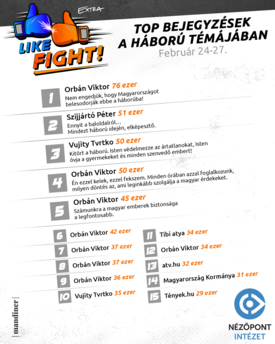 A Nézőpont Intézet elemzésében azt vizsgálta, kihez fordulnak a magyar facebookozók, amikor a háború kérdéséről van szó. A kutatás alapjául a különböző Facebook-oldalak interakciószámait – lájk, komment, megosztás – vették. Az elemzésben a február 24. és 27. közötti időszakban vizsgálták a vezető politikusok és a hivatalos oldalak teljesítményét, valamint kitekintettek a háborúval foglalkozó, legmagasabb interakciószámmal rendelkező bejegyzésekre is. A Nézőpont Intézet kutatását a Mandiner mutatja be cikkében.