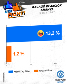 A baloldali politikusok számára nemcsak az jelenthet rossz hírt, hogy rendkívül rosszul teljesítettek a vizsgált időszakban, hanem az is, hogy a Márki-Zay Péter bejegyzéseire érkezett reakciók 13 százaléka egyszerűen „kacagás, nevetés.” A követői nevetős fejekkel reagálnak bejegyzéseire olyan esetekben is, amikor semmi humorosat nem posztolt. A Mandiner összehasonlításképp megjegyzi, Orbán Viktor bejegyzéseire érkezett reakciók mindössze 1,2 százaléka volt nevetés.