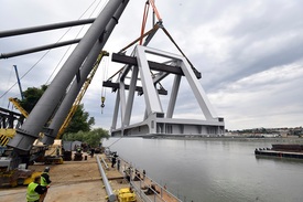 Hajóra emelték a megújuló Déli összekötő vasúti híd első elemét