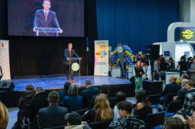 Hankó Balázs kultúráért és innovációért felelős miniszter beszédet mond a SzakMázz! pályaválasztási kiállítás megnyitóján a BOK Csarnokban 2025. november 11-én