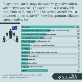 A Századvég kutatása kitért arra a kérdésre is, hogy a magyarok szerint jelenleg mi a legnagyobb probléma az Európai Unió brüsszeli vezetésével. Ebben az első helyre a korrupció került, amely „egyértelműen kimagasodik a vizsgált problémák közül” – húzta alá az agytröszt.