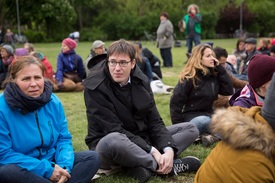 Karácsony Gergely a Greenpeace, a Ligetvédők és a VAResLIGET.blog.hu csoportok, a liget fáinak védelméért szervezett demonstrációján a Városligetben 2016. április 24-én.