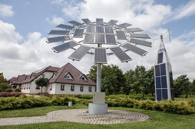 A közösségi ház komplexumát többek között egy napelemekkel egybeépített, függőleges tengelyű szélgenerátor, illetve a nap állását követő, és szimbolikusan virág formában elrendezett napelemes rendszer látja el energiával, még a parkoló tetején is napelem van – alatta pedig elektromos autóknak való töltőállomás. Mindez az épület áramigényének 90 százalékát fedi le. A fűtési energia 85-90 százalékát pedig faapríték adja, magyar fejlesztésű, magas hatékonyságú faelgázosító kazánokban hasznosítva. Az aprítékot részben a település közterületeinek és erdejének gondozása során keletkező ághulladék, másrészt a lakók kerti hulladéka, illetve a karácsonyfák adják, de energiaültetvényük is van. A kétévente learatott japán energiafűzből még maradni is szokott, amit eladnak. Ezenkívül napkollektorokat is szereltek fel a közösségi házra, nyáron az adja a meleg vizet.