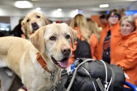 Lángos (elöl) és Trafi, a Baptista Szeretetszolgálat Törökországból hazaérkező speciális mentőcsapatának mentőkutyái a Liszt Ferenc-repülőtéren 2023. február 12-én.