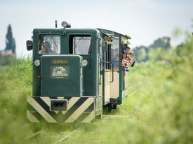 Az indulást hangos vonatfütty jelzi. A kis vonat erősen zötyögve halad a vadregényes tájon. Utastársainkkal együtt kíváncsian figyeljük a félig már learatott repcetábla fölött köröző gólyamadarat. A lehúzott vonatablakon kihajolva akár meg is érinthetnénk az út menti fák előre hajló ágait.