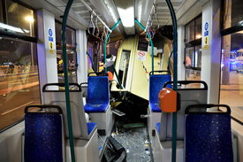 Budapest, 2022. december 20. Ráfutásos balesetben összeroncsolódott Combino villamos Budapest IX. kerületében, a Boráros térnél 2022. december 20-án. A 19-én este történt baleset helyszínérõl a mentõk egy súlyos és öt könnyebb sérültet vittek kórházba. Reggelre helyreállt a közlekedés a 4-es és a 6-os villamos vonalán. MTI/Lakatos Péter