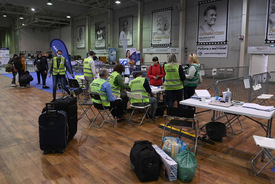 Ukrajnából érkezett menekülteket regisztrálnak a budapesti BOK csarnokban létesített humanitárius tranzitpontban