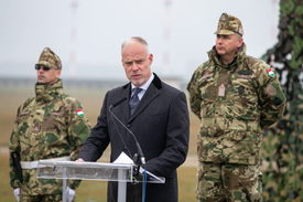 Szalay-Bobrovniczky Kristóf honvédelmi miniszter beszédet mond az egységes alapkiképzést teljesítő önkéntes területvédelmi tartalékos állomány katonai eskütételén Kecskeméten, az MH 59. Szentgyörgyi Dezső Repülőbázison 2022. november 9-én