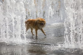Egy kutya fürdik a hõségben a Szabadság téri szökõkútnál 2021. július 13-án.