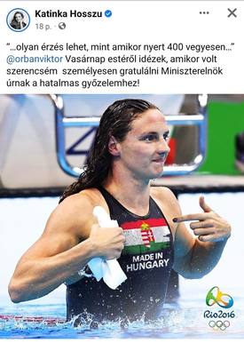 Hosszú Katinka háromszoros olimpiai, kilencszeres világ- és tizenötszörös Európa-bajnok úszó hivatalos Instagram-oldalán tette közzé, hogy vasárnap este személyesen is gratulált Orbán Viktornak a Fidesz-KDNP választási győzelméhez, amelyről a miniszterelnök azt mondta neki: „Olyan érzés lehet, mint amikor [Ön] nyert 400 vegyesen”.