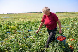 A bolti pénztárosként nyugdíjba vonult Lukács Mihályné öt éve dolgozik Nagy László kertészetében. Érkezésünkkor éppen a tenyérnyire nőtt korallpiros paradicsomokat gyűjti ládákba. A zöldségszedés órabére ezer forint. Az ültetvény mentén áradó intenzív paradicsomillat régi nyarak hangulatát idézi…