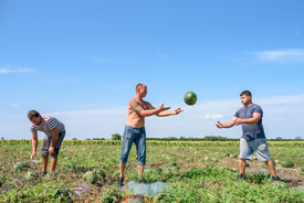 A dinnyeszüret embert próbáló munka, a gyakran 15 kilogrammosra hízó gyümölcsöket kézről kézre adva pakolják a teherautó platójára. A munkát főleg férfiak végzik, óránként nettó 1300 forintért. A nyolcórás műszakokért több mint tíz­ezer forint napidíj jár, de napszámost így sem könnyű találni.