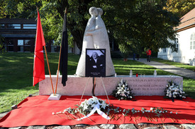 Esős időben egy kisebb emlékhely várja az érkezőket a főépület bejáratánál.