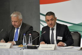 Potápi Árpád János, a Miniszterelnökség nemzetpolitikáért felelõs államtitkára (j) beszél, mellette Semjén Zsolt nemzetpolitikáért felelõs miniszterelnök-helyettes a világban szétszórtságban élõ magyarság szervezeteit tömörítõ Magyar Diaszpóra Tanács plenáris ülésén a fõvárosi Várkert Bazárban 2022. november 17-én.