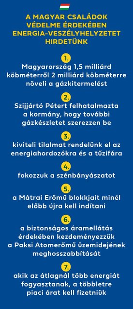a magyar családok és gazdaság energiaellátásának védelmére éppen ezért, több országhoz hasonlóan, a magyar kormány is energia-veszélyhelyzetet hirdetett és hét pontból álló intézkedési tervet fogadott el, amelyek augusztusban lépnek életbe.