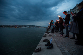 Az emlékséta résztvevői a sófár és a skót duda hangjára indultak el a budapesti Március 15. térről, és a Jane Haining, majd az id. Antall József rakparton vonultak a Cipők a Duna-parton emlékműhöz. A menetet holokauszt-túlélők vezették.