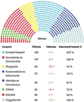 A mandátumbecslések szerint a 720 fős Európai Parlamentben továbbra is az Európai Néppárt (EPP) marad a legerősebb frakció 185 mandátummal, ami kilenccel több, mint öt éve. A Szocialisták és Demokraták (S&D) két helyet vesztve 137 mandátumra számíthat. A liberális Renew – amelynek Emmanuel Macron pártja, valamint a Momentum is tagja – 22 helyet bukva 80 mandátumot szerzett. A Zöldeknek sincs sok oka az örömre, ugyanis 19 helyet veszítve 52 mandátumuk lett, a szélsőbaloldalnak (GUE/NGL) pedig egy helyet vesztve 36. A Giorgia Meloni vezette Európai Konzervatívok és Reformisták (ECR) frakciója – ahová a lengyel PiS is tartozik – négy helyet erősítve 73 mandátumra számíthat, a szintén jobboldali Identitás és Demokrácia (ID) pedig – ide tartoznak Marine Le Penék, az Osztrák Szabadságpárt, a Flamand Érdek vagy a holland Szabadságpárt – 9 hellyel erősítve 58 mandátumra. A Politico előrejelzése szerint 99 független képviselő lesz – ide tartozik jelenleg a Fidesz is.