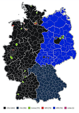 Persze nem csak vesztesei vannak a választásnak: a kereszténydemokrata CDU/CSU pártszövetség harminc százalékot kapott (29 mandátum), második erőnek pedig, 15,9 százalékra (15 mandátum), feljött a német politikában barna veszedelemként kiátkozott, bevándorlásellenes Alternatíva Németországnak (AfD). A helyi választási eredményeket bemutató térképen egyértelműen látszik, hogy nyugatot elvitte a CDU, keletet az AfD, Bajorországot a CSU, több nagyvárosban pedig a Zöldek értek el jó eredményt.