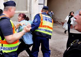 Egy kilakoltatást megakadályozó adóst rendőrök vezetnek el