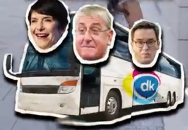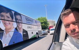Lencsevégre kapták a Demokratikus Koalíció kampánybuszát, amelynek oldalán Gyurcsány Ferenc felesége és Karácsony Gergely egymás mellett látható.