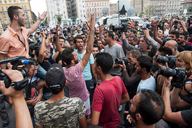 A metró bejárata előtti tágas tér nyomortanyává vált: sátrak, hálózsákok, fekhelyül szolgáló, kiterített kartonpapírok, személyes holmik és azok gazdái feküdtek egymás hegyén-hátán. Megközelíteni lehetetlen volt őket, amikor fotós kollégánknak mégis sikerült, néhány jó húsban lévő, dühös arab férfi támadt rá, amiért megpróbálta őket lefényképezni. Megkísérelték kitépni kezéből a munkaeszközt, de nem sikerült, ezért hirtelen megálltak és akcentus nélkül utána kiáltották: