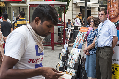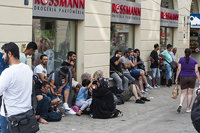 „Ha a hegy nem megy Mohamedhez, Mohamed megy a hegyhez” – tartja a mondás, és minden bizonnyal Jehova Tanúi is ezt az elvet követve érkeztek a helyszíne. A pályaudvarral szemben lévő kis utcában fogtak hozzá a hittérítéshez, és a bátorságuk meghozta a gyümölcsét: már volt olyan migráns, amelyik a kiadványukat lapozgatta. A menekültáradat persze a turistákat sem hagyta hidegen: a japánok szokásukhoz híven fényképezőgéppel a kezükben figyelték az eseményeket, és olykor mosolyogva vetődtek oda egy-egy migráns mellé, hogy közös portré is készülhessen a Facebookra. Távolodva a pályaudvartól, egy-két utcával arrébb már nem éreztük úgy, mintha egy idegen országban járnánk. Békés, csendes utcák, tisztaság és rend, sehol egy menekült, és magyar szót is hallottunk.