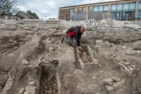 Távolabb tőlünk a feltárt sírokat fényképezi és adminisztrálja a csapat egyik nő régésze, Gulyás Gyöngyi. Jobb híján egy műanyag málnásrekeszt használ irodaszekrénynek. Azt mondja, nagyon fontos mindig a gyors alkalmazkodás az új helyhez, például ide, a faluba egy autópálya-építés régészeti feltárásáról érkezett, amúgy pedig ő is Szegeden végzett, és a Tisza-parti városban lakik.