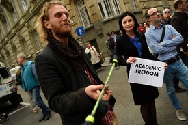 Ezek után térjünk rá a mostani, hazai eseményekre. A kormány elleni akciósorozat, a CEU-t is érintő törvénymódosítás ürügyén, április 2-án egy többezres tüntetéssel kezdődött: a résztvevők a Fővám térről a Soros-egyetem Nádor utcai épülete elé, végül az Országházhoz vonultak. Ez még békésen ért véget. Két nappal később azonban már szintet léptek a tiltakozók, akik a hivatalos demonstráció – élőlánc a CEU épülete körül – befejezése után ismét a Kossuth térre vonultak. Miután a Parlament lépcsőjén felsorakozott rendőrök megakadályozták, hogy a tüntetők kitűzzék az uniós zászlót, ezúttal már dulakodás alakult ki a rendfenntartók és az agresszív aktivisták között.
