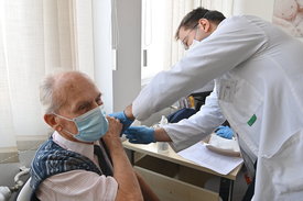 Hargita János, az Észak-Közép-budai Centrum Új Szent János Kórház és Szakrendelő főorvosa a Pfizer-BioNTech koronavírus elleni vakcinájával oltja be Bendek Gézát az Új Szent János Kórházban 2021. február 25-én