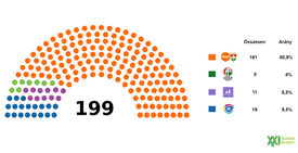 Az ellenzéki pártok közül – a hazai választáson a közös indulás esetén érvényes 10 százalékos bejutási küszöb miatt – az MSZP-Párbeszéd már be sem jutna az Országgyűlésbe, míg a legnagyobb parlamenti frakcióval, 19 mandátummal a Gyurcsány-féle Demokratikus Koalíció rendelkezne. A DK mellett még két ellenzéki pártnak lenne frakciója, a Momentum 11, a Jobbik 8 képviselőt küldhetne a parlamentbe.