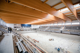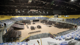 A sportcsarnok parkettájára már nem lehet felmenni utcai cipővel. Egy művezető figyelmeztet erre bennünket, aki a csarnok küzdőterén folyó munkát irányítja. Most állítják össze az egymásba csúsztatható mobil lelátókat. A rendes széksorok már a helyükön vannak, a mobil lelátók csak afféle kiegészítésnek számítanak, hogy ezekkel együtt négyezer nézőt is fogadhasson majd a Kaposvár Aréna. A telt ház borítékolható, hiszen a város kosárlabda- és röplabdacsapata is hagyományosan az élvonalban játszik.