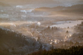 A drónnal készült képen a reggeli pára és füst Salgótarján Zagyvaróna településrésze felett Salgótarján közelébõl fotózva 2025. december 27-én.