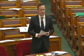 Szijjártó Péter nyitóbeszéde az éghajlatváltozásról szóló, 2018. december 12-i parlamenti politikai vitán. A külügyminiszter mögött az ellenzék üresen hagyott székei…