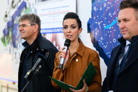 Koncz Zsófia, a Kulturális és Innovációs Minisztérium családokért felelős államtitkára beszédet mond, mellette Dankovics Gergely, a program igazgatója (j) és Varga Gábor, a térség fideszes országgyűlési képviselője (b) az induló Mentál Pajzs program első, sárbogárdi állomásán 2025. október 14-én