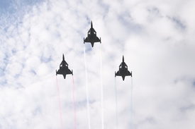 A Magyar Honvédség Gripen vadászrepülőgépeinek köteléke a budapesti Kossuth tér fölött a Szent István-napi állami ünnepségen tartott tisztavatáson 2025. augusztus 20-án
