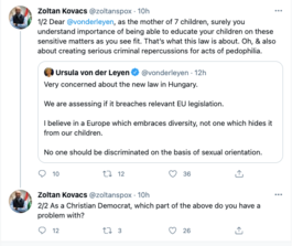 Az Európai Bizottság elnöke, Ursula von der Leyen a Twitteren fejezte ki aggodalmát a magyar pedofiltörvénnyel kapcsolatban, és hozzátette: egy olyan Európában hisz, amely támogatja a sokszínűséget és nem elrejti azt a gyermekek elől.